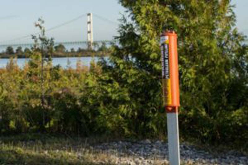 FILE- In this Sept. 23, 2015, file photo, the Mackinac Bridge is visible from a marker near Enbridge Line 5 on the northern shore of the Straits of Mackinac in Michigan. Operators of twin oil pipelines beneath the swirling waterway where Lakes Huron and Michigan converge insisted Monday, March 13, 2017, that they remain structurally sound even though an outer layer of protective covering has worn away in some places, while skeptics said the deterioration is further evidence the lines should be shut down. (Neil Blake/The Grand Rapids Press via AP, File)