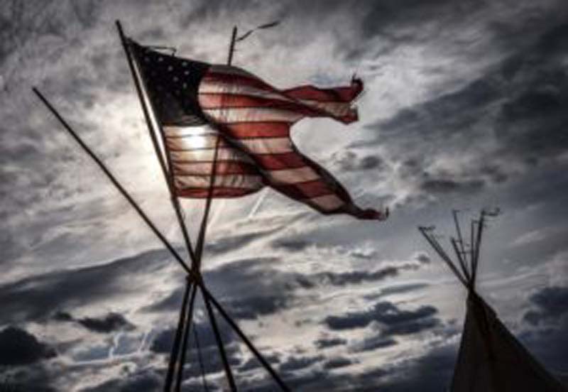 Sunlight shines through a well worn US flag as Native American tipis are erected on the Monument grounds in advance of a march by Standing Rock members against the pipeline on March 07, 2017 in Washington (Bill O’Leary/The Washington Post)